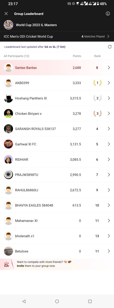 In the IL Master group, things were not so one sided but it was not in anyways could be called a close encounter. The Dark Horse made it look easy at the end to win it by nearly 100 points from the next master. The Dark horse as we all know had mastered the art of making interesting line ups. However, he now also mastered the way to make those teams click. He is another true holder of his alias. Great job Dark Horse. Keep it up.
