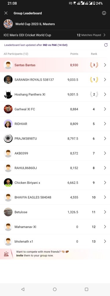 In the IL Master group, it was the day of the Dark Horse. He did what he does best. He did not pick up Gill in Ahmedabad pitch, neither did he pick Sharmaji who scored a 63 ball 86 and still somehow managed to win this. However, knowing him he never cared about taking risks and this time he had the luck to support him as well. He is now a strong contender of one of the tournament rewards. Great job today Mr Dark Horse. Keep it up.