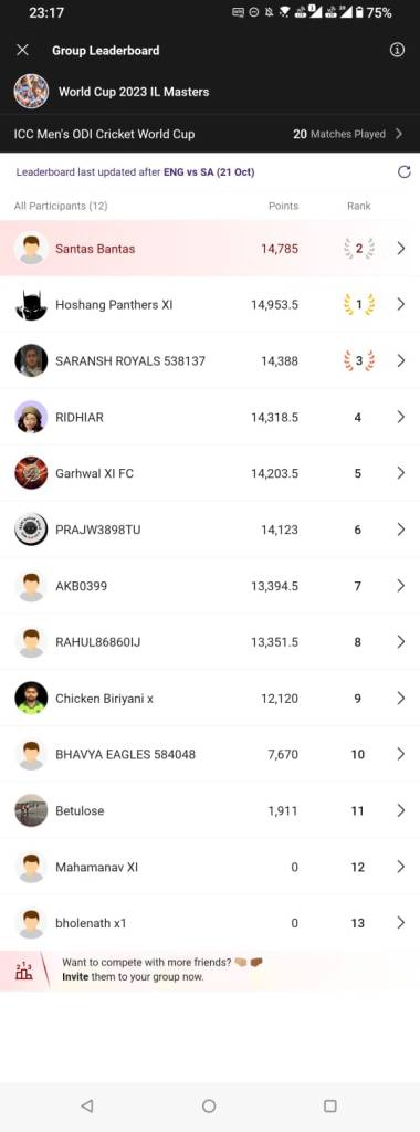 The second came the Dark Horse. He tried his best to stop the unstoppable but in the end the Invincible came out too good for him. He did do his bit though. He selected 7 players from the winning team may be by luck or may be by out of the blue or may be just to do something different to keep us entertained and that gave him the advantage. Keep up the good work Dark Horse. Great game and congratulations.