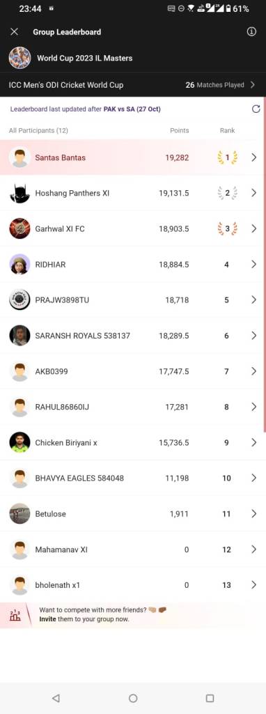 The IL Master group was not far behind in terms of another nail biting finish where the Dark Horse came victorious. Dark Horse had started the tournament well and after that he had shown glimpse of brilliance. However, from the last few games he is not doing well. It is rumoured that some dark force was wroking behind his fall. However, looks like he came out of it. He made all the right choices today and his selection of Head as captain was the risky move which gave him the greatest dividend. Well done Dark Horse and good come back. Congratulations.