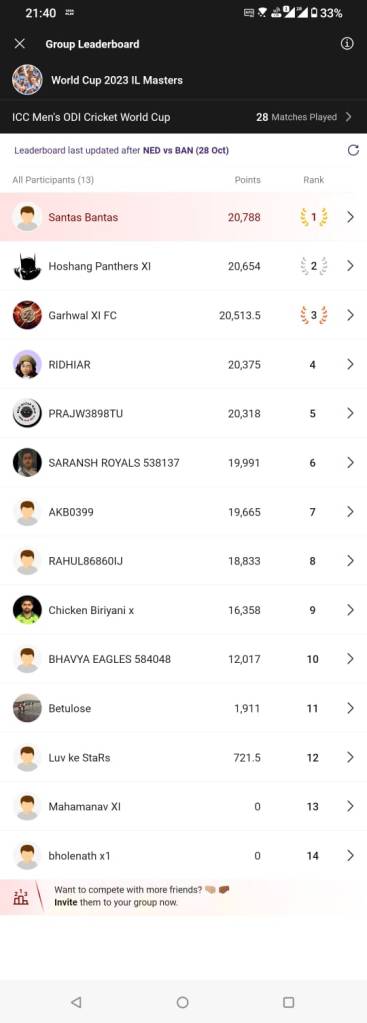 In the IL Master group, the Chupe Rustam came top again. This is second time in the last 3 matches he came at top. In fact, he was in top 3 in the last match as well. By skill of a chess master and a patience of a monk he is slowly showing why his name is so apt. He is rumoured to be empowered by powerful blessing from from some Bengali baba. However, that is only a rumour to spread fear amongst the other master. Great job Chupe Rustam. Keep it up. However, don’t think that other master will let you keep it up just like that so be ready for some real challenge and best of luck.