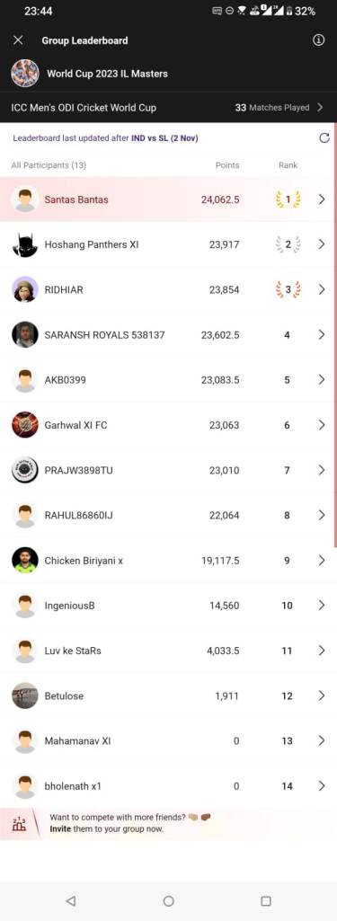 In the IL Master group, the day belonged totally to the Dark Horse. In today’s match from the very first ball to the very last ball no one even came close to him. His impeccable choice of captain and vice captain along with the bowlers ensured that he is far ahead of his next opponent in the end. Dark horse had his bad days and his good days. On the bad days he usually is found at the bottom of the table and on his good days there are hardly any who could compete with him. He in true sense is a Dark Horse. Through out the tournament he claimed the top position again and again against all odds. His choice of team shows an innate genius which others can only dream of. Congratulations on this awesome win Dark Horse and best of luck.