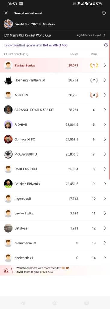Off the field, in the IL Master group the Veteran clutched it again with his vice captain for second time in last 4 matches. Veteran who had quite a good tournament so far was lucky enough to clutch with the same tactics twice. Both the times his trump card was exposed by the master of trump card the Chupe Rustam. He knew and predicted exactly what is going to happen and it happened. With this win the Veteran now have the highest wins and he is for sometime leading the leader board as well. Hope the luck continues for some more matches. Best of luck for that and congratulations.