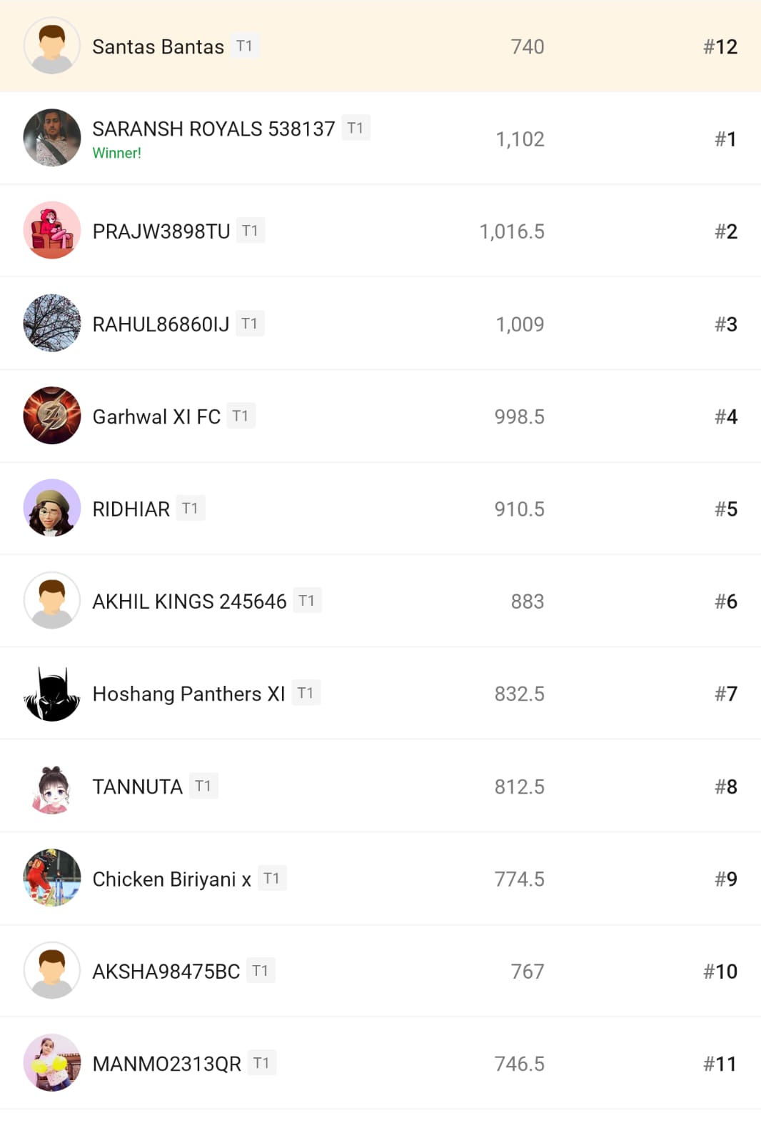 The Terminator came distant second with nearly 100 points behind. The Terminator in the past had seen long bad patches. So, starting the tournament at second position might give him the confidence he needed. Go for it Terminator. Show others why you are named after the most celebrated villain of 90’s. Congratulations and best of luck for the upcoming match.