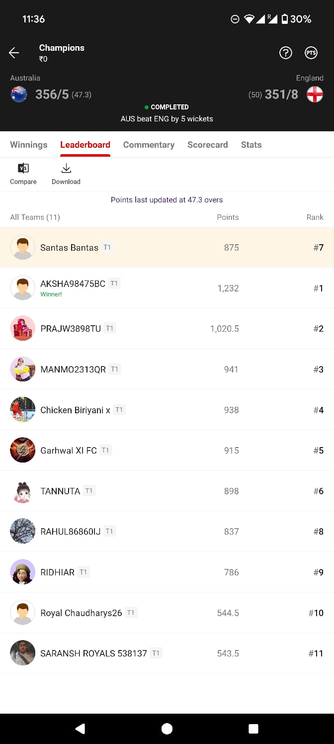 The second came the Terminator. The Terminator unlike previous tournaments was quite consistent this time. In fact, even though he came second in this match, in overall point standings he is at top right now beating the table topper Dark Horse who had rather bad day today in Dreams 11. Well done Terminator. Consistency is the key here and now that the Terminator knew this, there may be nothing that could stop him. Best of luck for that and congratulations for the win.