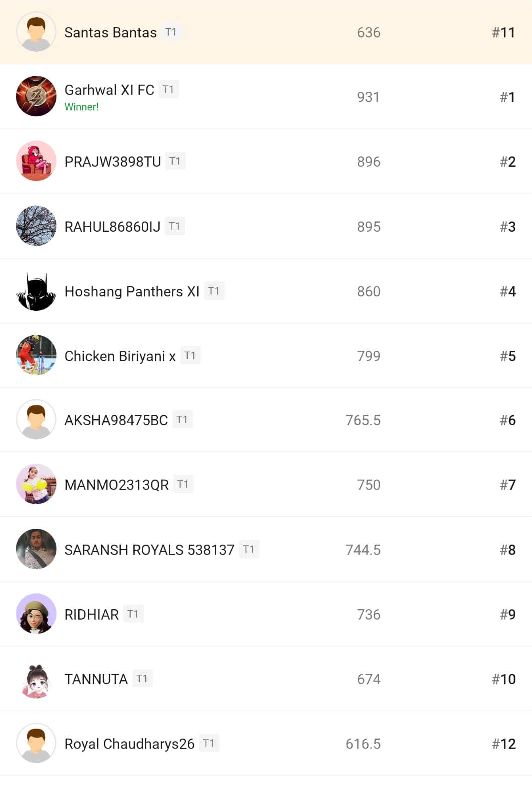 The Terminator seems to have taken hold of the second position as his own. This is second time in consecutive matches he came second. In fact, his team selection was one of a kind. He had 10 out of 11 players chosen from India. India returned the favor. It is only Kohli as a captain who made all the difference between him vs the ClucthGod. However, I am sure in today’s match, he or anyone from this group was actually playing for personal gain. It was always India first. The Terminator ensured that by picking a team where he does not need to do it in any other way. Hats off for that. Congratulations and best of luck.